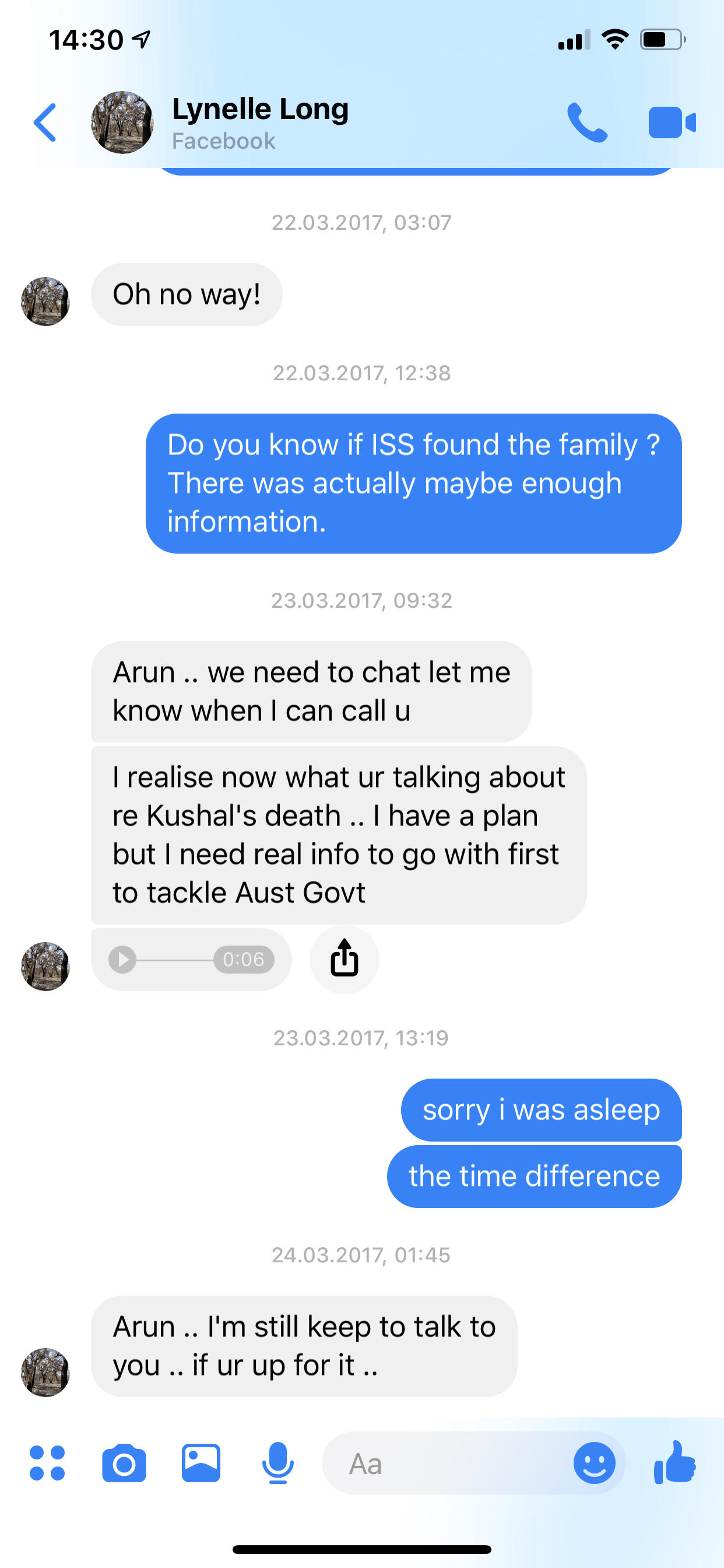 FB chat Lynelle - Kushal suicide Document type: News paper article Publication date: 22 March 2017 .Organizations: International Social Service (ISS), ISS Australia aka International Social Services Australia, Intercountry Adoptee Voices ( ICAV ) Attachments unnamed (1).jpg (222910 Bytes)