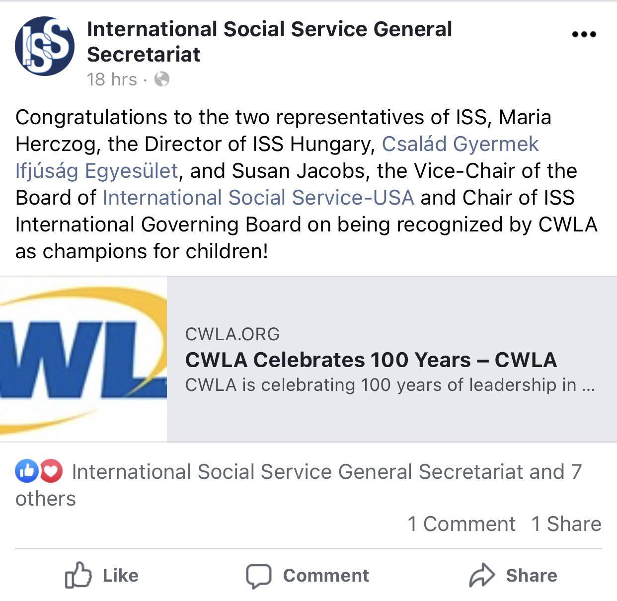ISS International Governing Board recognised by CWLA as champions for children! Document type: News paper article Publication date: 22 December 2020 .Organizations: International Social Service (ISS) - Germany, International Social Service (ISS)Persons: Susan S. Jacobs, Maria Herzcog aka Maria Herzog Attachments IMG_2254.jpg (610814 Bytes)