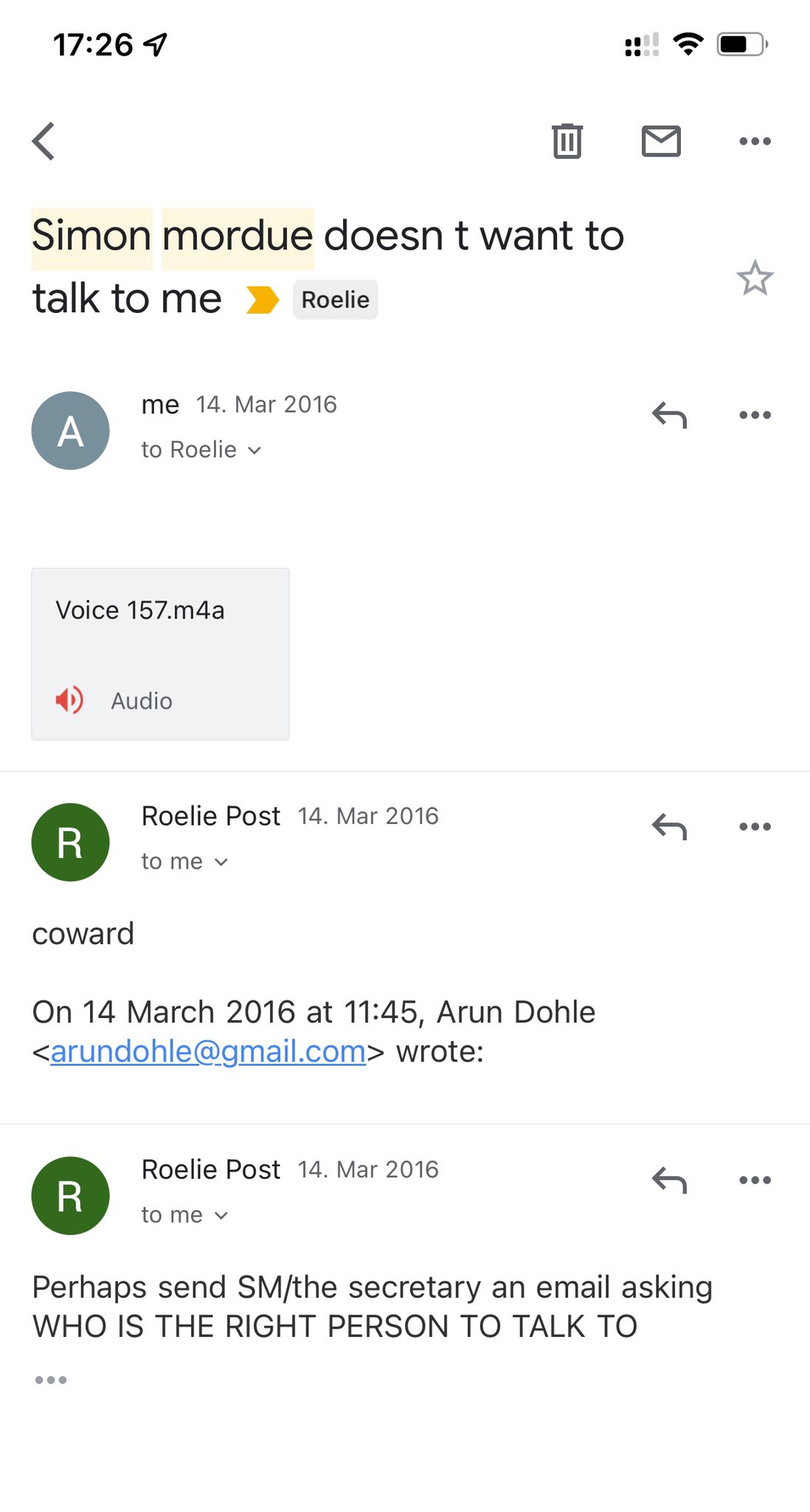 AD call to Simon - refuses to speak ever (and follow-up mail) Document type: Web page copy Publication date: 14 March 2016 Call on file Persons: Simon Mordue Attachments Whatsapp Simon 1.jpeg (107330 Bytes) WhatsApp Image Simon 2.jpeg (116624 Bytes)