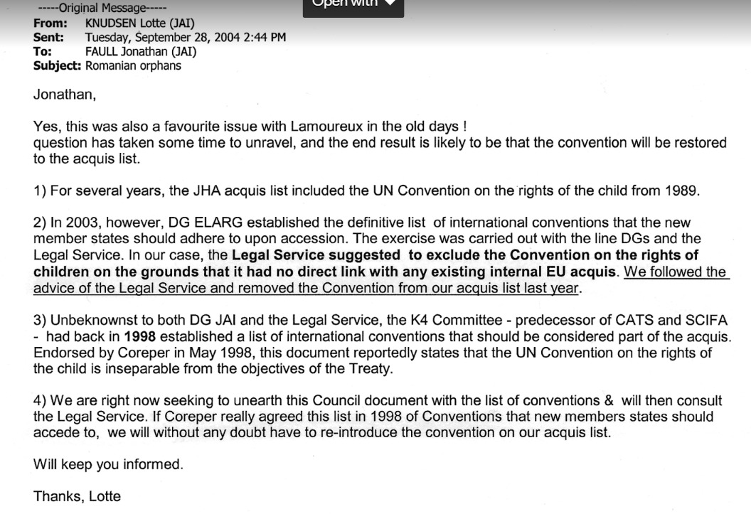 Knudsen to Faull about acquis Document type: Web page copy Publication date: 28 September 2004 . Organizations: Acquis Communautaire, UNCRC acquis or not?Persons: Roelie Post (European Commission), Jonathan Faull Attachments PHOTO-2022-04-10-22-57-43.jpg (206161 Bytes)
