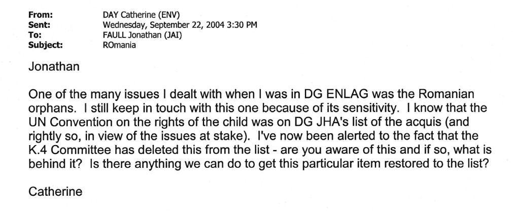 Catherine Day to Jonathan Faull: Romania - UNCRC deleted Document type: Web page copy Publication date: 22 September 2004 . Organizations: Acquis Communautaire, UNCRC acquis or not?Persons: Catherine Day, Jonathan Faull Attachments PHOTO-2022-04-10-23-01-37.jpg (94531 Bytes)