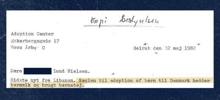 In March 1983, the Danish adoption agency AC Børnehjælp received a typewritten letter from one of the agency's employees in Lebanon. It was a Danish woman whose job was to help the agency find children for adoption.