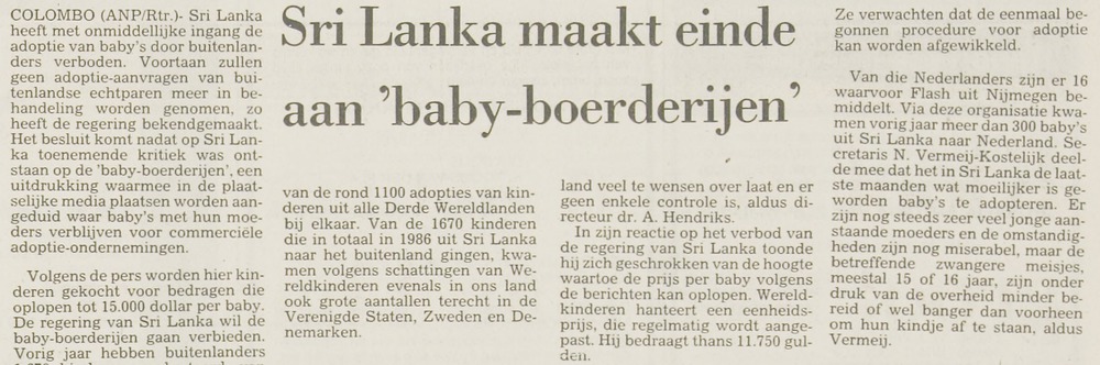 Sri Lanka maakt einde aan baby boerderijen Source: leiden.courant.nu Publication date: 5 June 1987 Countries: Sri Lanka, NetherlandsOrganizations: Wereldkinderen aka NICWO, Stichting Kind en Toekomst, Stichting FLASH Attachments Sri lanka 1987 stoppen babyfarms.pdf (180350 Bytes) Sri Lanka einde babyfarms.jpg (131398 Bytes)