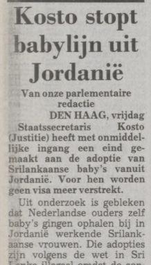 Kosto stopt Baby Lijn uit Jordanie (Sri Lanka) Source: www.delpher.nl Publication date: 21 May 1993 De Telegraaf21-05-19933Countries: Jordan, Sri Lanka, Netherlands Attachments Kosto stopt baby lijn uit Jordanie.pdf (65789 Bytes) Sri Lanka Jordan.jpg (18942 Bytes)
