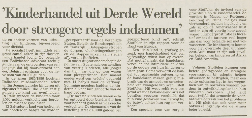 Kinderhandel uit de Derde Wereld door strengere regels indammen (Stoffelen Rapport) Source: leiden.courant.nu Publication date: 1 October 1987 Leids Dagblad 1 oktober 19877Countries: Netherlands Attachments Stoffelen kinderhandel.jpg (200911 Bytes)