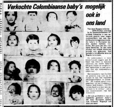 Verkochte Colombiaanse baby's mogelijk ook in ons land Source: resolver.kb.nl Publication date: 25 July 1981 De Telegraaf25-07-19811Countries: Colombia, Netherlands Attachments Verkochte COlombiaanse babys.jpg (42227 Bytes)