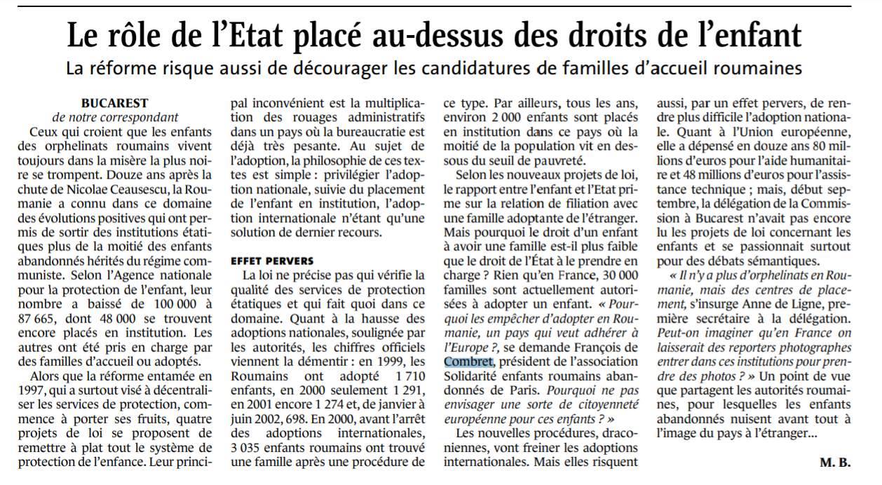Le rôle de l’Etat placé au-dessus des droits de l’enfant Source: scholar.lib.vt.edu Publication date: 5 October 2002 Persons: Francois de Combret (Francois Polge de Combret) Attachments Mirel Bran 2002.png (724797 Bytes)