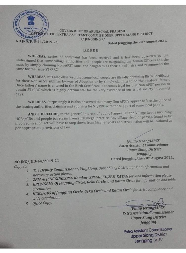 “Some local people are illegally obtaining Birth Certificate for their Non-APST siblings by may of Adoption or by simply claiming to be their natural father. Once fathers’ name is entered in the Birth Certificate it becomes legal for that Non APST person to obtain ST/PRC which is highly detrimental for the very existence of our tribal society in the coming days,” read the official notification, dated August 20, 2021.